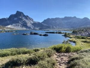 At Reds Meadow we had dinner and breakfast as well as a shower and then set up for the day. Mainly a day of ascent – but passing many beautiful lakes. Gladys, Rosalie and Shadow Lakes all pristine. Then we crossed over to Garnet Lake and finally Thousand Island Lake. As its name suggests the lake is dotted with many small islands providing a unique appearance. This provided the perfect backdrop with Mount Ritter and Banner in the background.