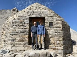 We started early. Passing iconic Guitar Lake we began the long climb up tight switch backs to Trail Crest. The switchbacks pulled us high above the lakes we had passed earlier in the morning. The 1.9 miles from Trail Crest to the summit were long and hard. The trail was mainly talus, with canyons and couloirs dropping off precipitously. Eventually we ascended the final crest and the famous hut came into view. Standing on the summit of Mount Whitney – the start of the JMT.