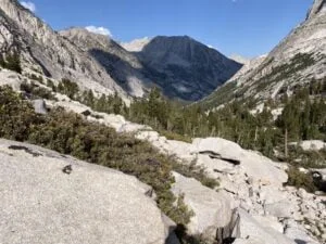 From the Palisades it’s a steep drop into Le Conte Canyon. The first part of this is down the Golden Staircase. A set of 50 tight, stone-step switchbacks that cut their way down through gullies. There was the beautiful aroma of wild herbs as we wound our way down. The steep descent ended and we followed Palisade Creek until it joined the middle fork of the Kings River. Heading north we had lunch at the Bishop Pass Trail turn off and were back on familiar ground from last year’s hike. We knew now we had the long ascent towards Muir Pass, leaving the meadows and rising through the forest and back above the tree line.