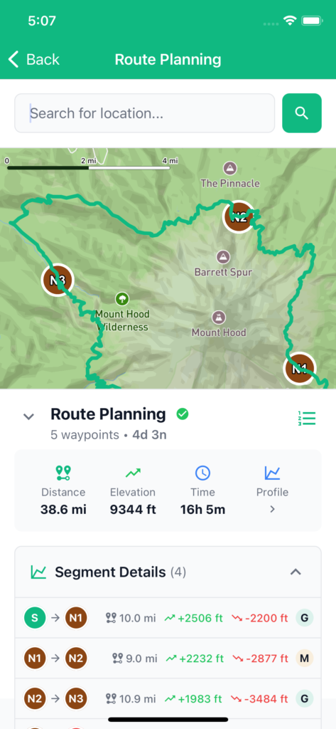 TrailSync uses Mapbox’s Outdoors style mapping—meaning you actually see trails, contour lines, and terrain. Add waypoints by tapping the map, categorize them (campsite, water source, emergency exit), and let the app calculate segment distances and elevation changes automatically.